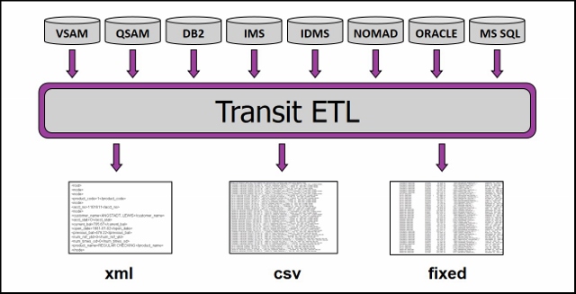 Transit ETL is designed to allow non-technical users to quickly and easily extract data from the mainframe and mid-tier systems (e.g. VSAM, QSAM, IMS, DB2, IDMS, Oracle and SQL Server), transform the data using over 100 built-in functions and operators, and save the data in one of a variety of formats, including fixed, delimited and XML. Extremely flexible, Transit ETL can be used for one time data migration projects or in daily production jobs utilizing the built-in scheduling facilities.
